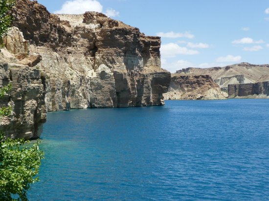 Another comparable lake is Band-e Azhdahar (The Dragon), located a few kilometres southeast of the town of Bamyan, which has also been created as a result of carbon dioxide rich water oozing out of the faults underground and depositing calcium carbonate precipitate to form the travertine walls of Band-e Amir.